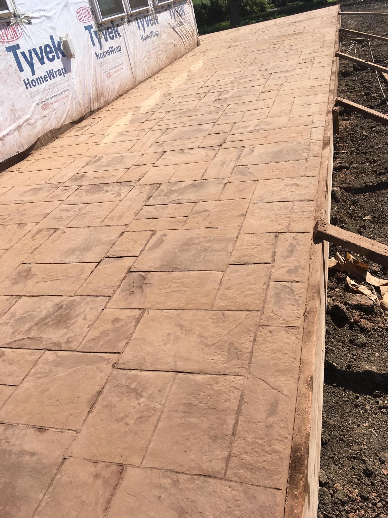 Stamping concrete can be difficult but rewarding. This style of concrete stamp is stone. This concrete has had color put in it while it was still in the truck. color can make the concrete look very interesting. This was a porch that wrapped around a house. After a month this slab will be pressure washed and sealed. When it is all done it will look a lot smoother and glossy.