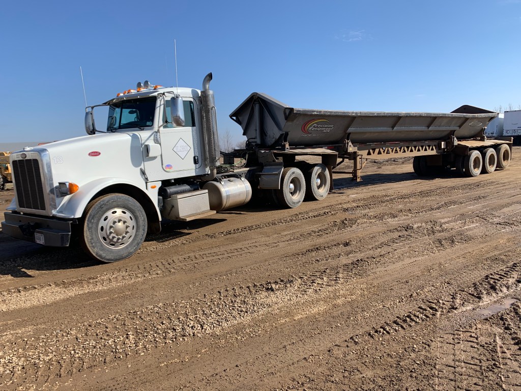 This is a 2012 Peterbilt with a 2012 side dump. We use this setup quite often. This setup can be very useful when you are doing concrete or construction. Not only can it be used to haul gravel and dirt, it can also be used for hauling trees and concrete. A dump truck could work to do most of the work. A side dump can haul a lot more though and also a lot bigger chunks.